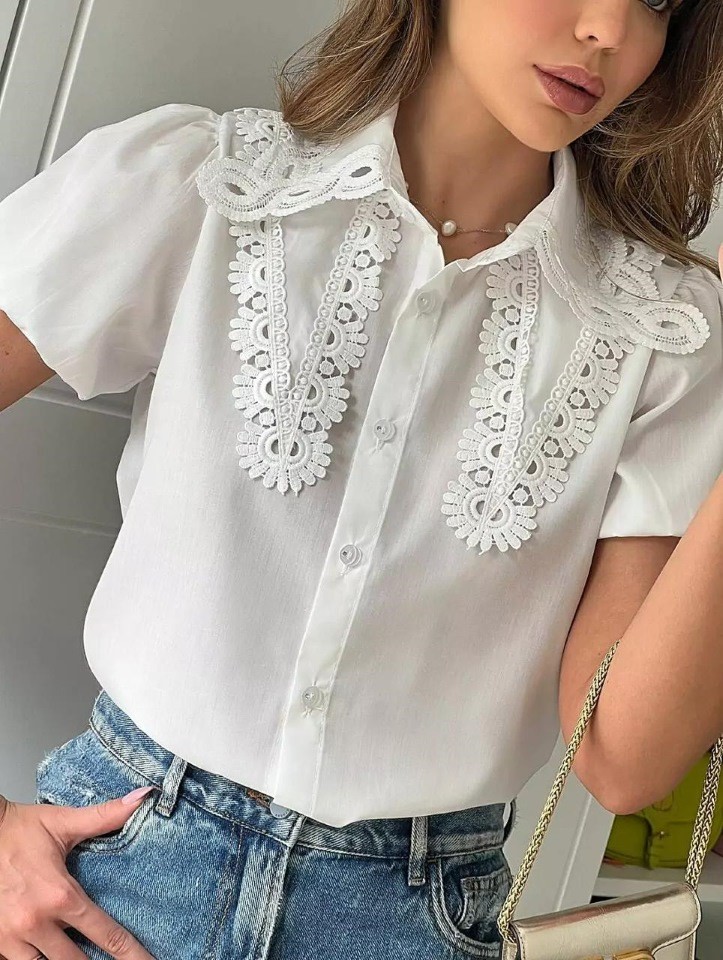 Os detalhes bordados aplicados na parte frontal e na gola elevam a peça, adicionando um toque romântico e refinado ao visual. As mangas curtas levemente estruturadas completam o design com feminilidade e charme.
