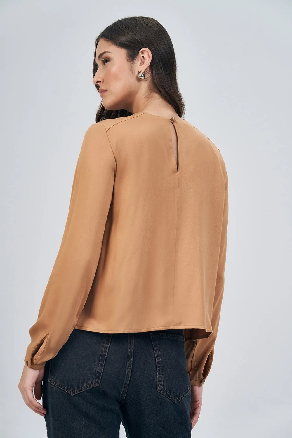 Possui modelagem reta, que valoriza diferentes tipos de corpo, além de mangas longas com punho ajustado, conferindo acabamento refinado. O tecido tem toque macio e excelente fluidez, ideal para composições versáteis que transitam do look de trabalho ao casual chic.
