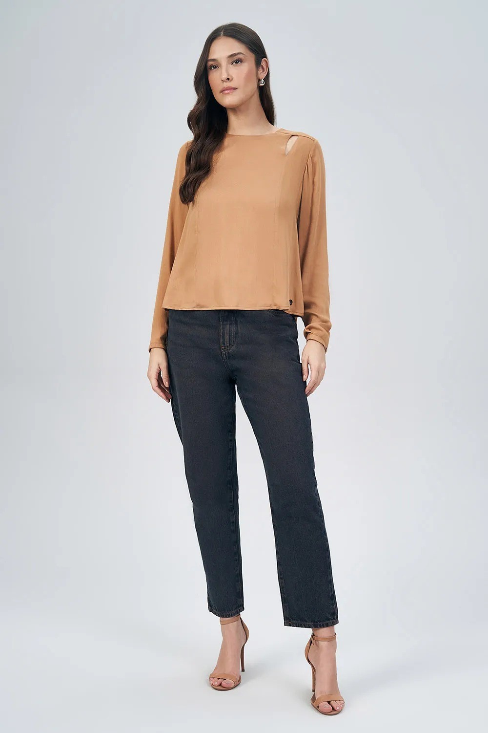 Blusa feminina de manga longa confeccionada em tecido leve e fluido, com caimento solto que garante conforto e elegância. O decote redondo clássico recebe um charme especial com o recorte delicado no ombro, trazendo um toque moderno e sofisticado à peça.