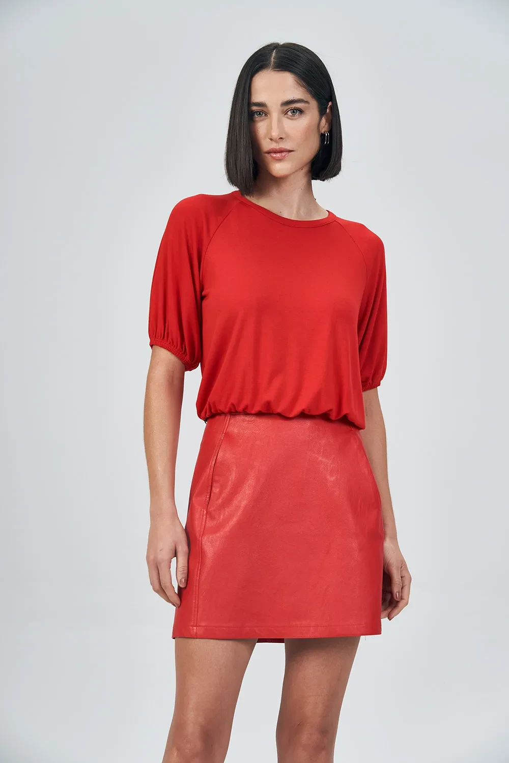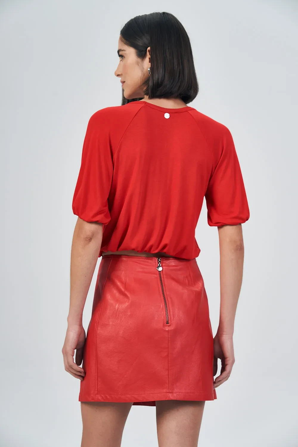 A modelagem soltinha com acabamento levemente ajustado na barra valoriza a silhueta e garante conforto ao vestir. Na cor vermelha intensa, é uma peça vibrante e elegante, perfeita para composições que vão do casual ao sofisticado, combinando facilmente com saias, calças ou peças em couro.