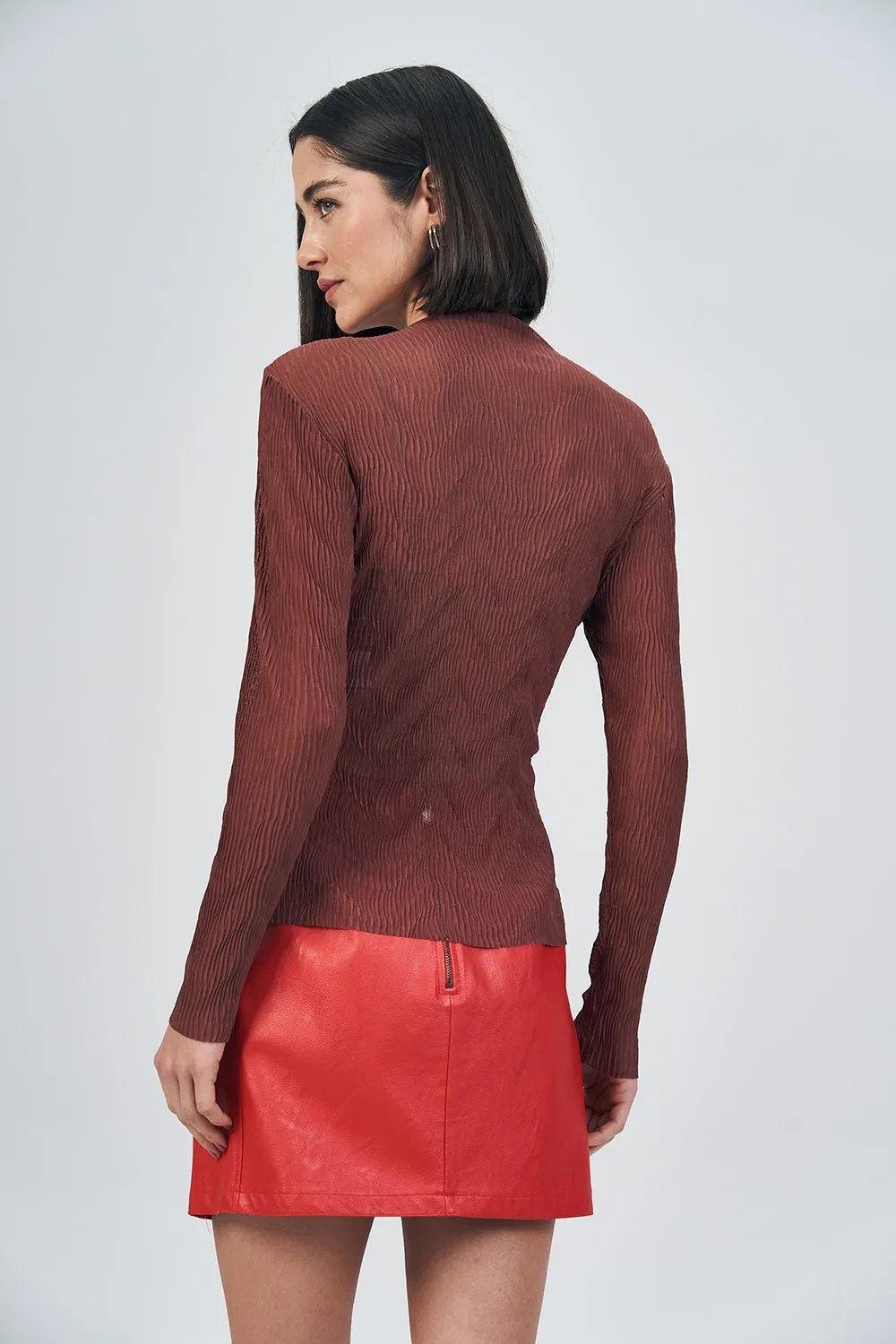Blusa feminina confeccionada em tecido leve e delicadamente texturizado, com efeito ondulado que traz sofisticação e um visual diferenciado. Possui transparência sutil, ideal para composições elegantes e modernas.