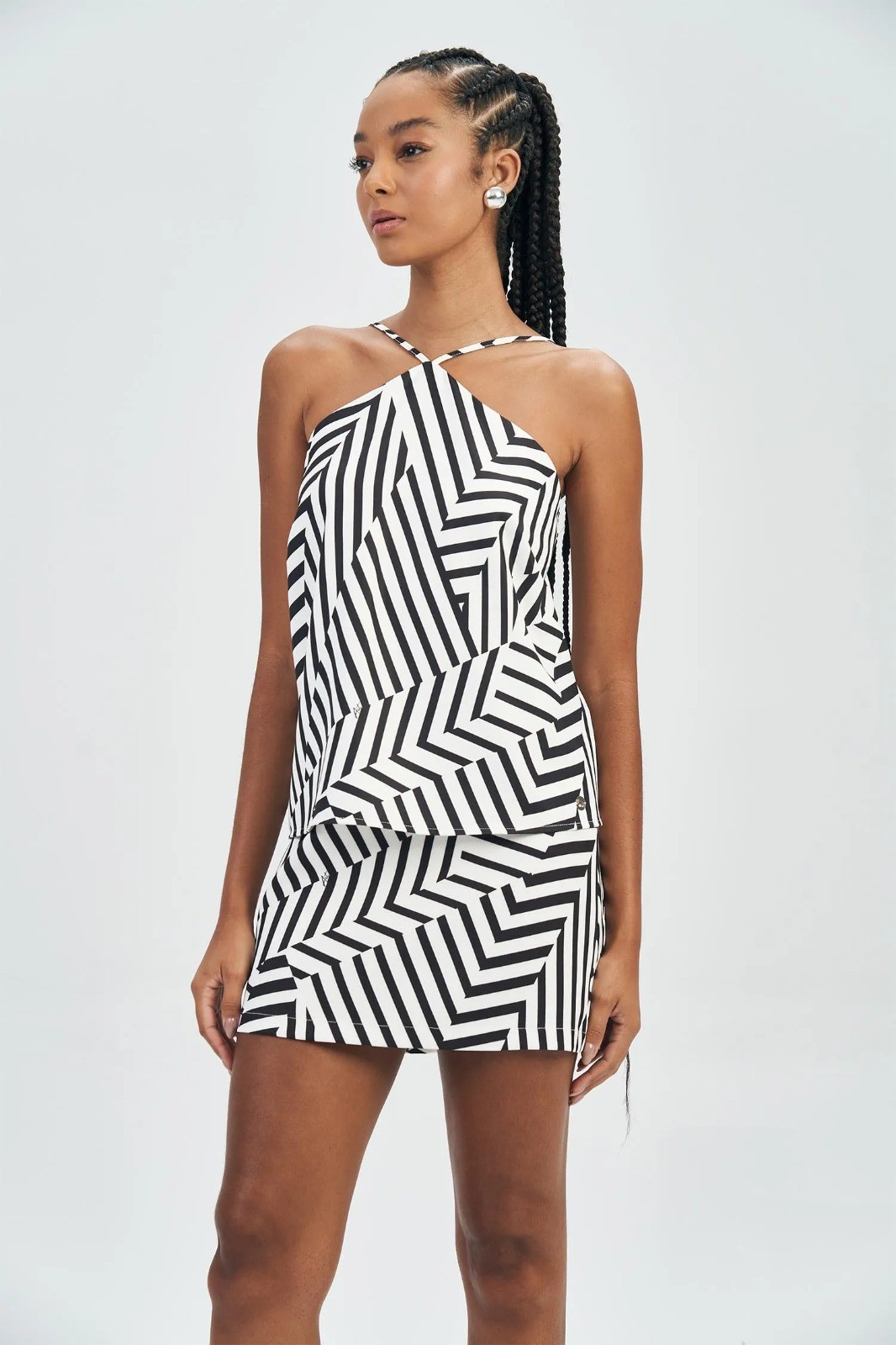 Blusa feminina com design moderno e elegante, confeccionada em tecido leve e fluido, que proporciona conforto e excelente caimento. O modelo apresenta decote halter com alças finas transpassadas no pescoço, valorizando os ombros e o colo de forma sofisticada.