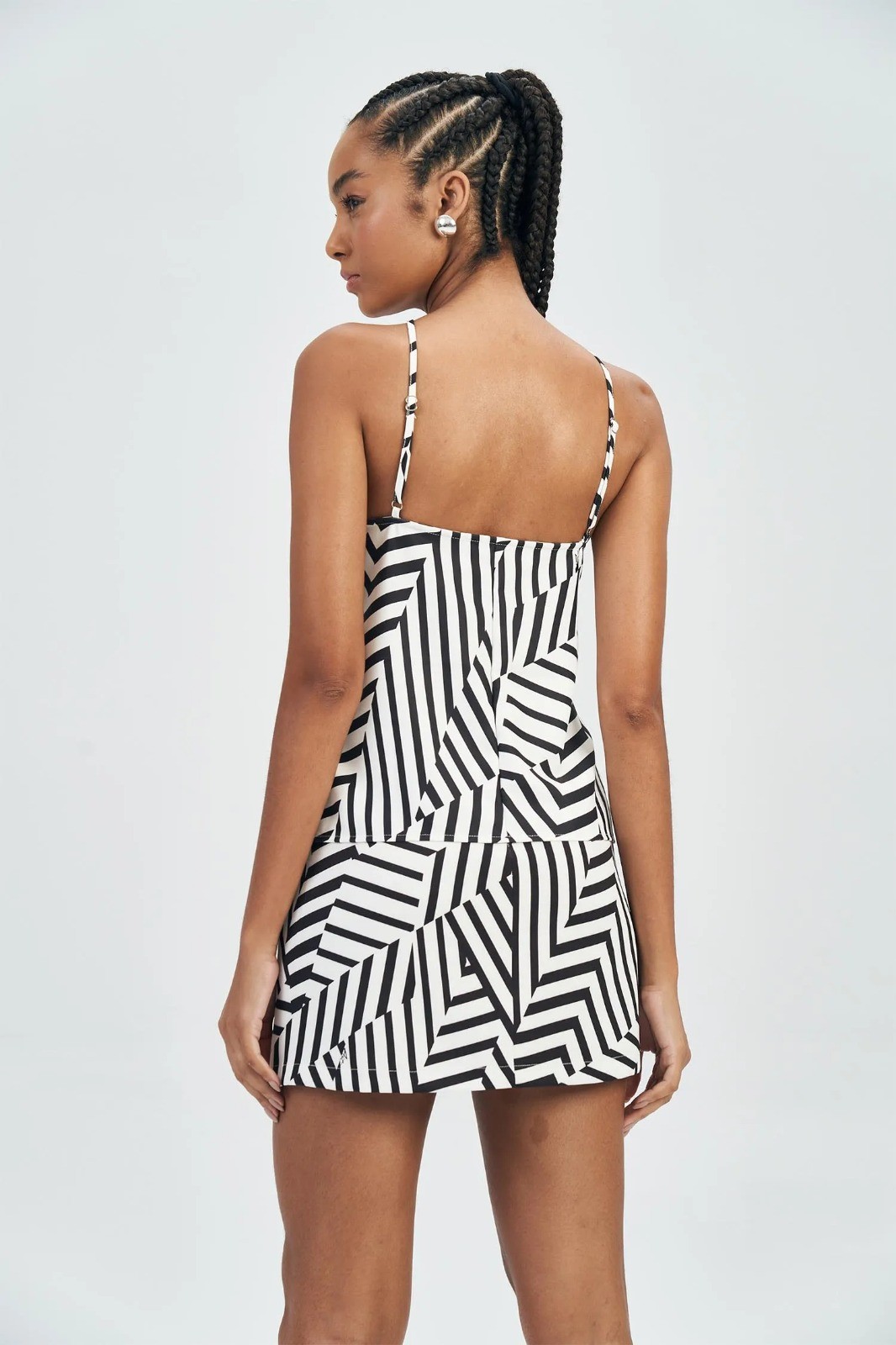 A estampa geométrica em preto e branco confere um visual contemporâneo e marcante, enquanto o recorte frontal assimétrico adiciona movimento e charme à peça. Com modelagem solta, a blusa é versátil e pode ser combinada com saias, alfaiataria ou jeans, compondo looks que vão do casual chic ao elegante com facilidade.