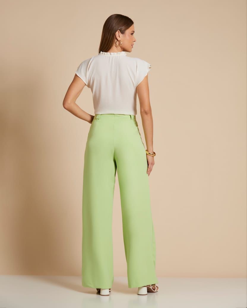 Calça feminina confeccionada em tecido de alfaiataria com toque macio e excelente caimento. O modelo possui cintura alta com cós estruturado, fechamento frontal discreto e pregas que valorizam a silhueta. A modelagem reta levemente ampla proporciona elegância e conforto, alongando visualmente o corpo.