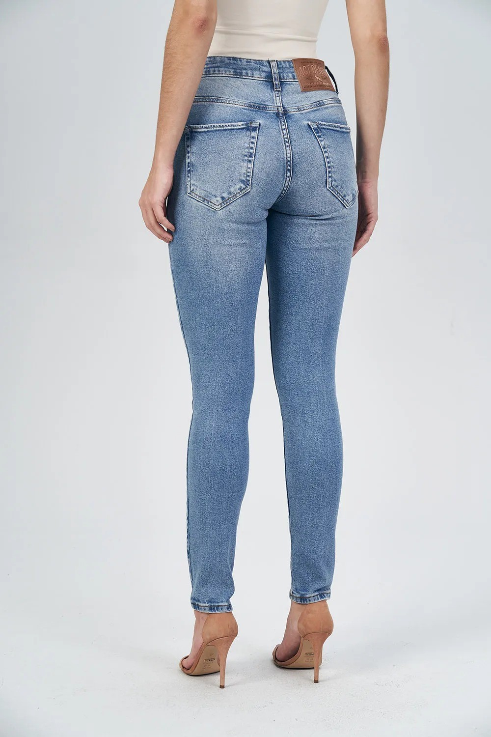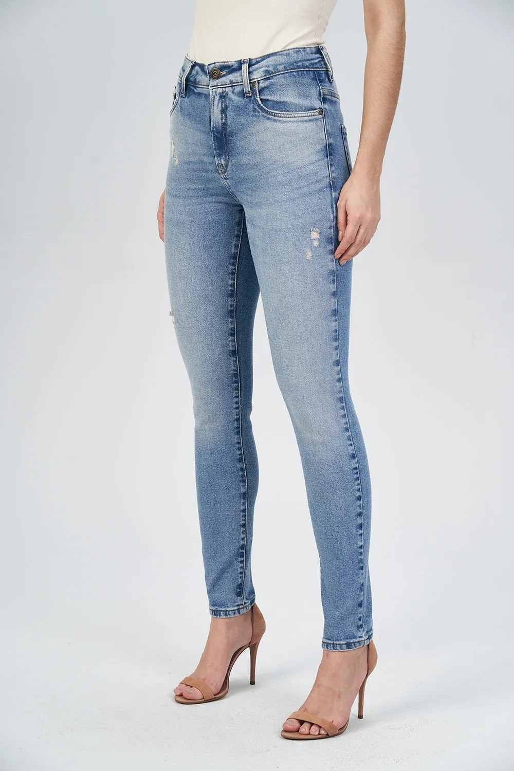 Calça jeans feminina com modelagem skinny, perfeita para valorizar a silhueta com conforto e elegância. Possui cintura média, fechamento por botão e zíper, além de bolsos funcionais frontais e traseiros. A lavagem clara com efeito estonado traz um visual moderno e versátil, enquanto os leves detalhes destroyed adicionam um toque fashion na medida certa. Confeccionada em jeans com elasticidade, garante ajuste confortável ao corpo, ideal para compor looks casuais ou mais sofisticados