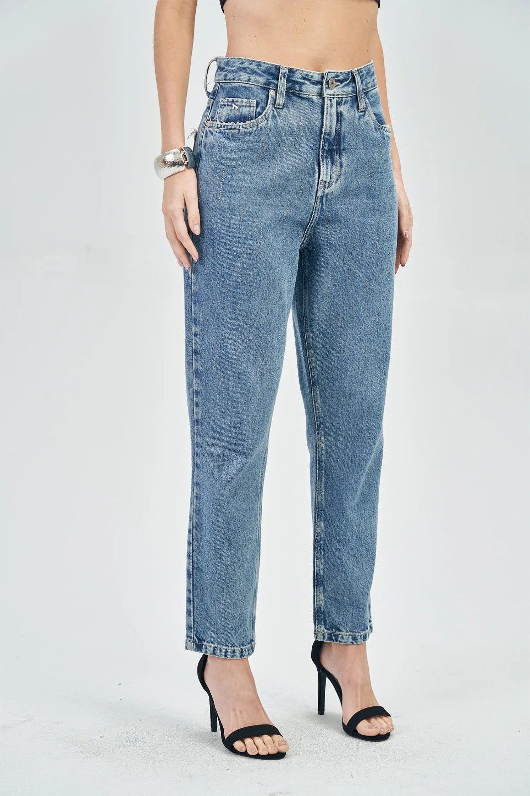 Calça Jeans Azul Médio Mom Fit Feminina com Strass