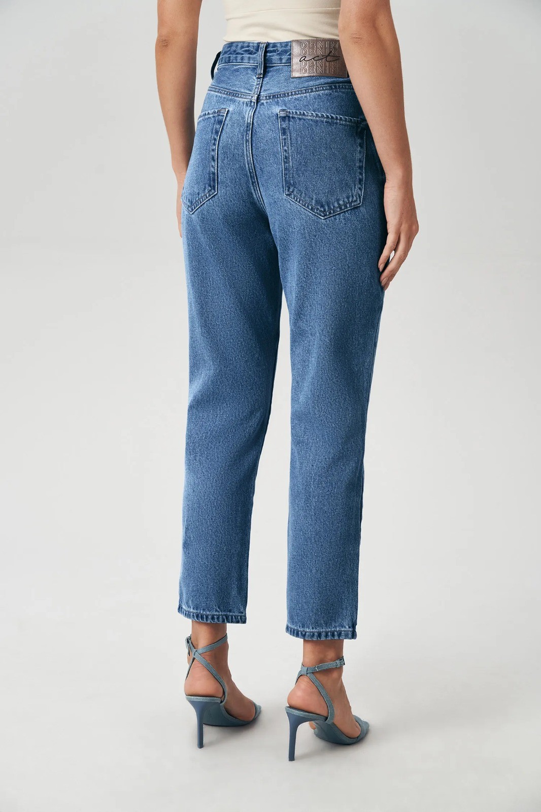 Calça jeans de modelagem reta com comprimento levemente cropped, perfeita para unir conforto e estilo em uma única peça. Confeccionada em jeans de lavagem azul média, possui cintura média/alta que valoriza a silhueta e garante um caimento impecável.