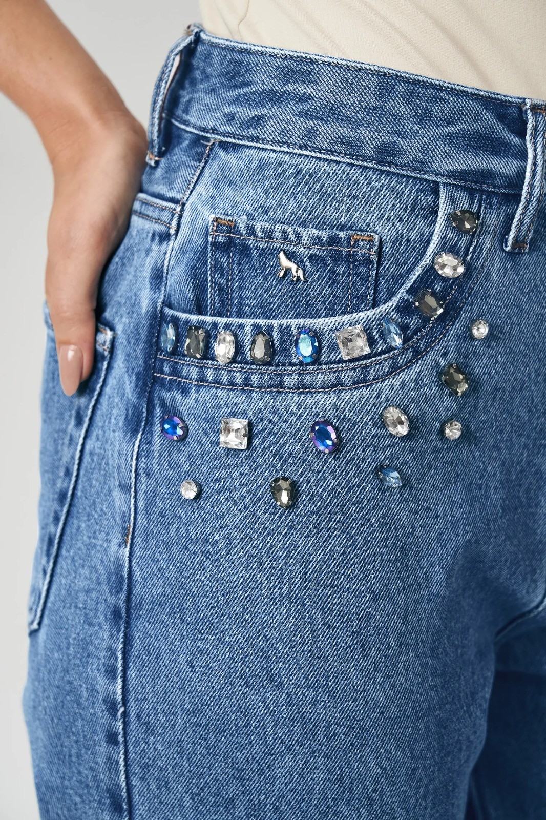 O grande destaque fica por conta das aplicações em pedrarias nos bolsos frontais, que adicionam um toque sofisticado e moderno à peça, elevando o visual do casual ao fashion. Conta com fechamento frontal por botão e zíper, bolsos funcionais e acabamento de alta qualidade.