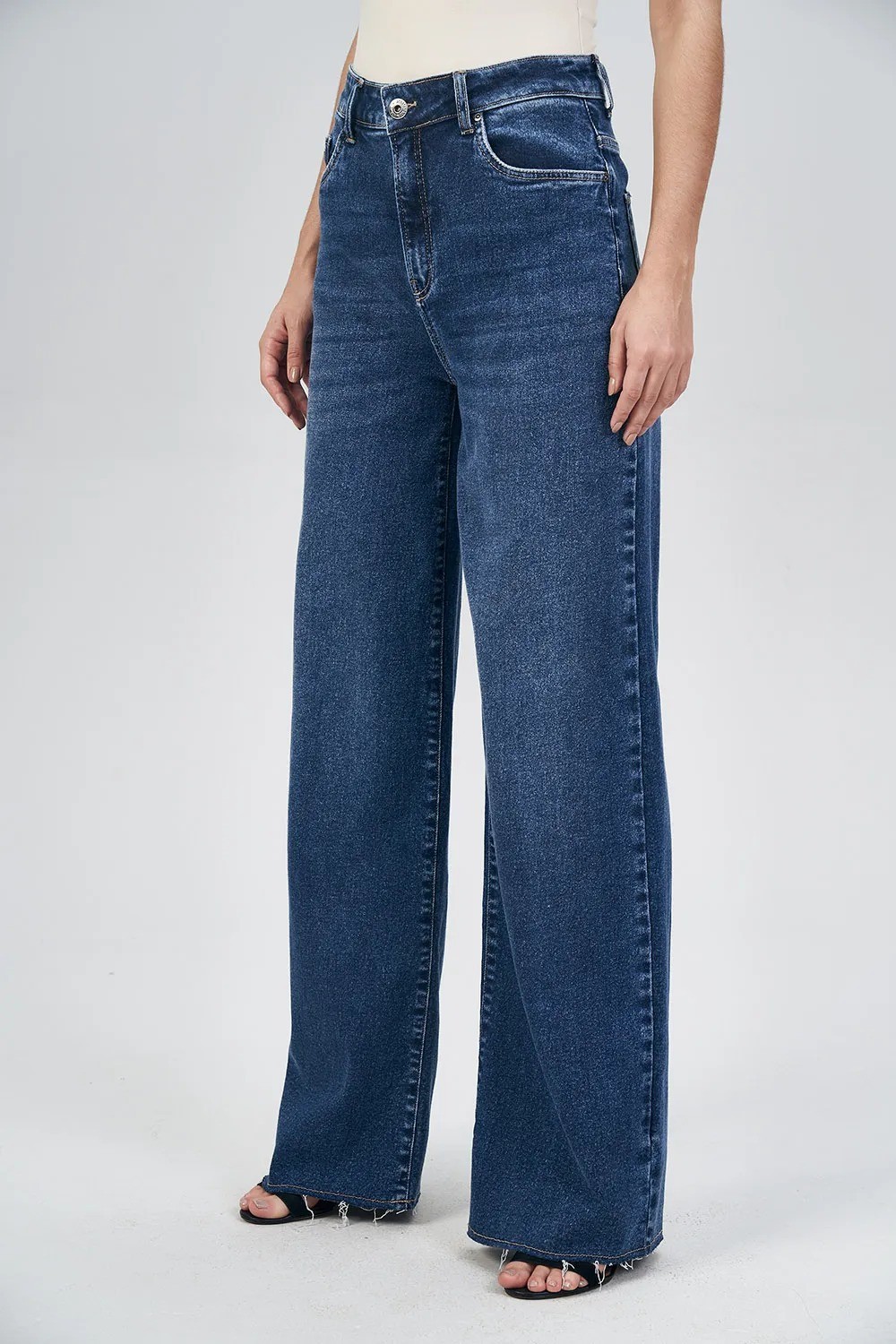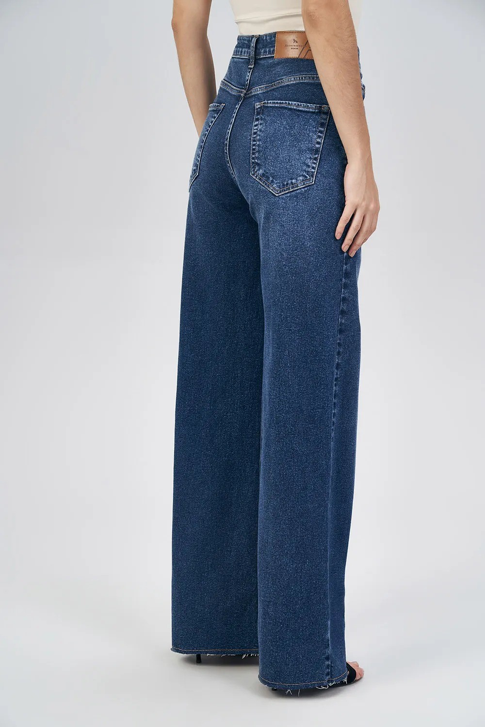 Calça jeans feminina em modelagem wide leg, com pernas amplas e caimento reto, garantindo conforto e um visual elegante e atemporal. Possui cintura média a alta, que valoriza a silhueta e proporciona um ajuste seguro ao vestir.