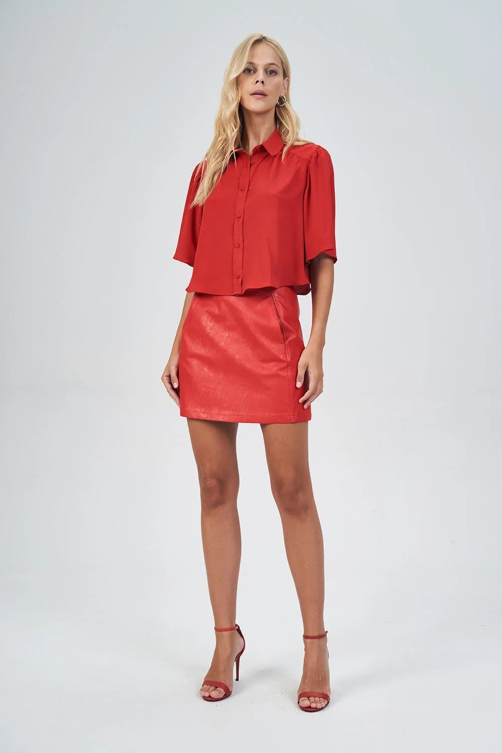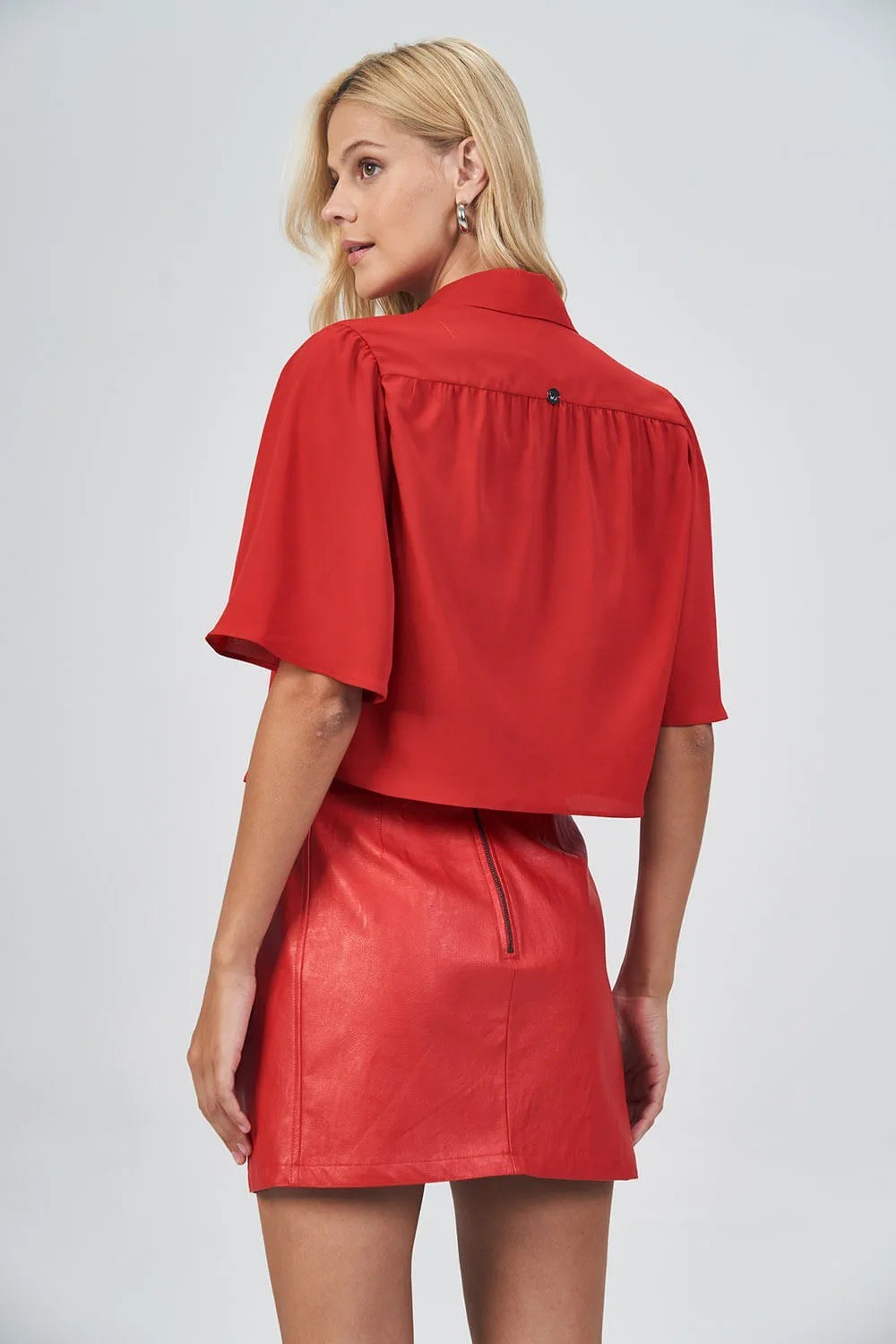 O destaque fica por conta das mangas curtas com leve volume nos ombros, que adicionam um toque moderno e feminino à peça. A modelagem levemente cropped valoriza a silhueta e permite combinações versáteis com peças de cintura alta, como saias, calças ou alfaiataria.