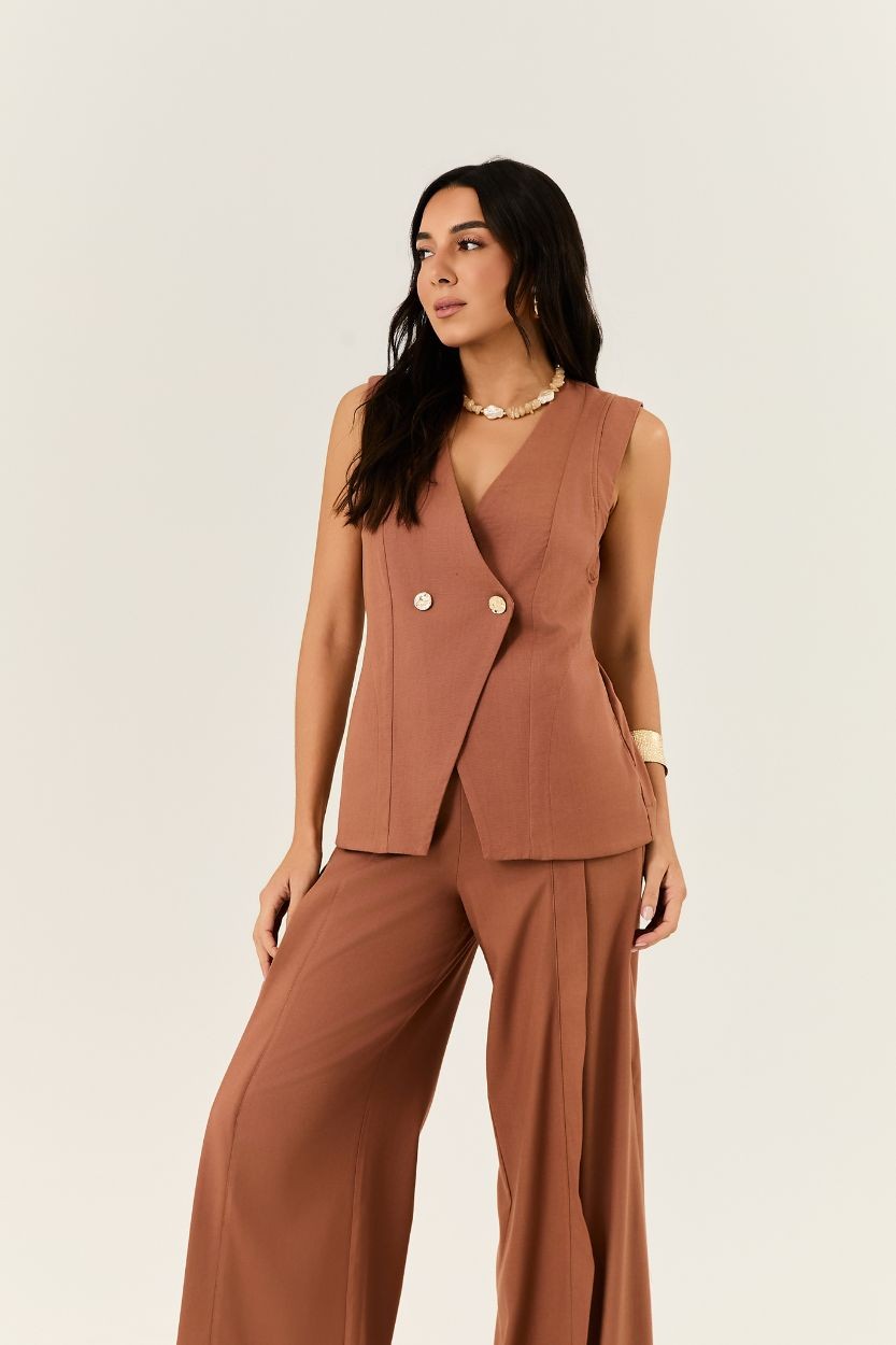 CONJUNTO COM COLETE TRANSPASSADO E CALÇA PANTALONA