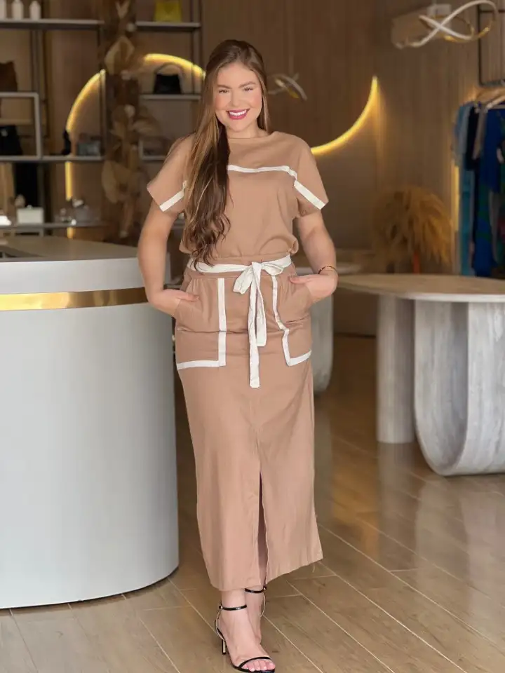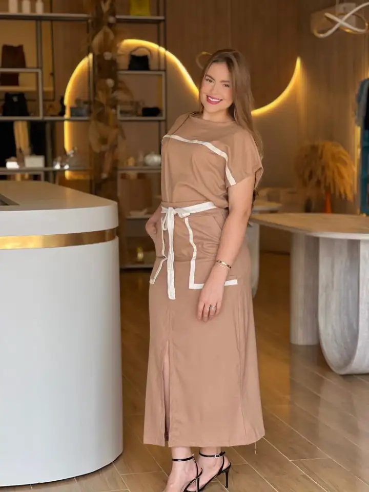 CONJUNTO COM DETALHE EM AMARRAÇÃO E FENDA NA PARTE FRONTAL DA SAIA.