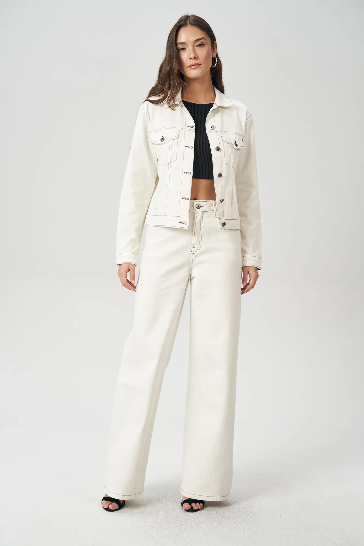 Jaqueta feminina em jeans off-white, com design moderno e acabamento sofisticado. Confeccionada em tecido encorpado de alta qualidade, oferece estrutura, conforto e excelente durabilidade.