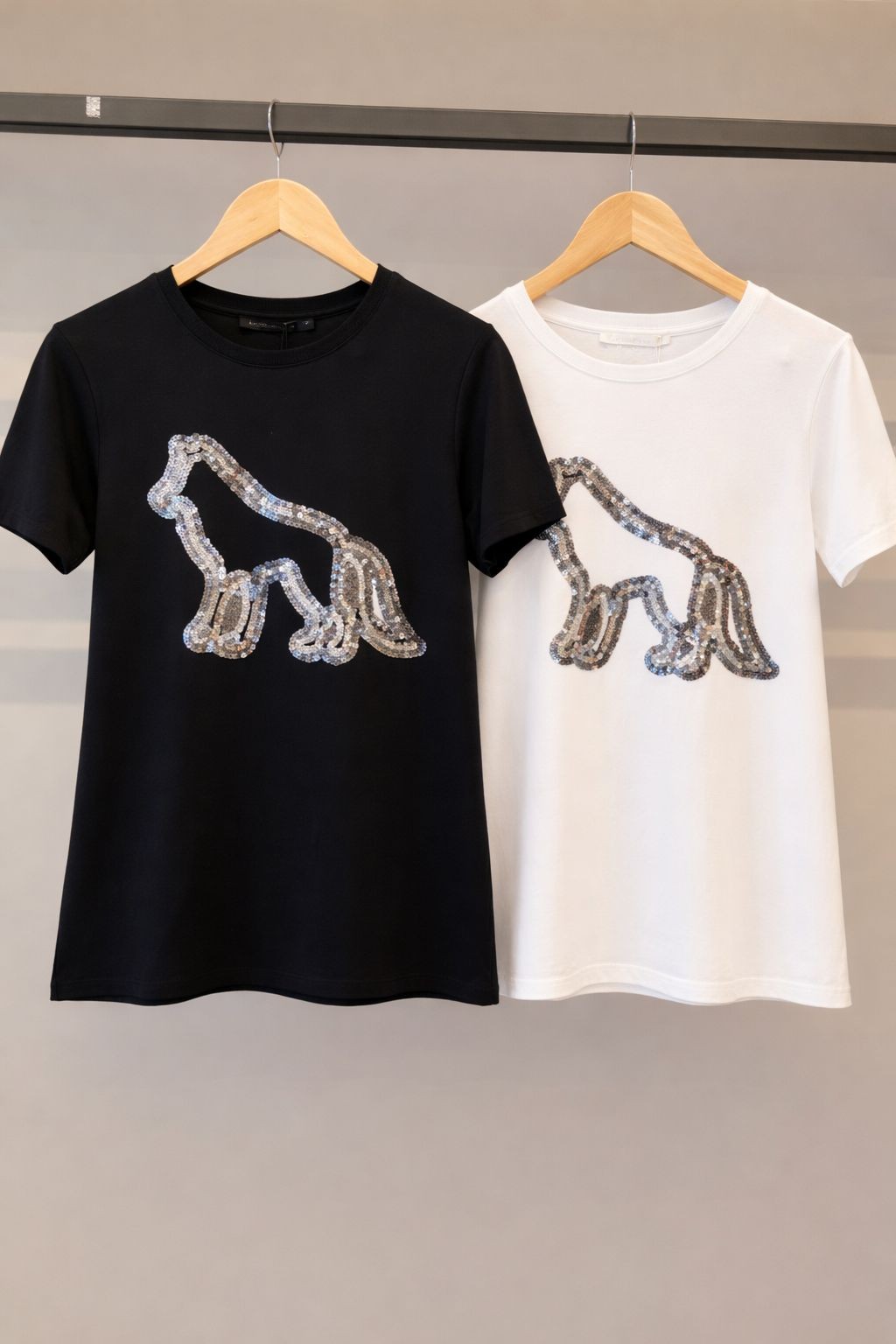 T-shirt feminina com design moderno e sofisticado, disponível nas cores preto e branco. O destaque da peça fica por conta da aplicação frontal em paetês, formando um desenho animal estilizado que adiciona brilho e personalidade ao visual, sem perder a elegância.