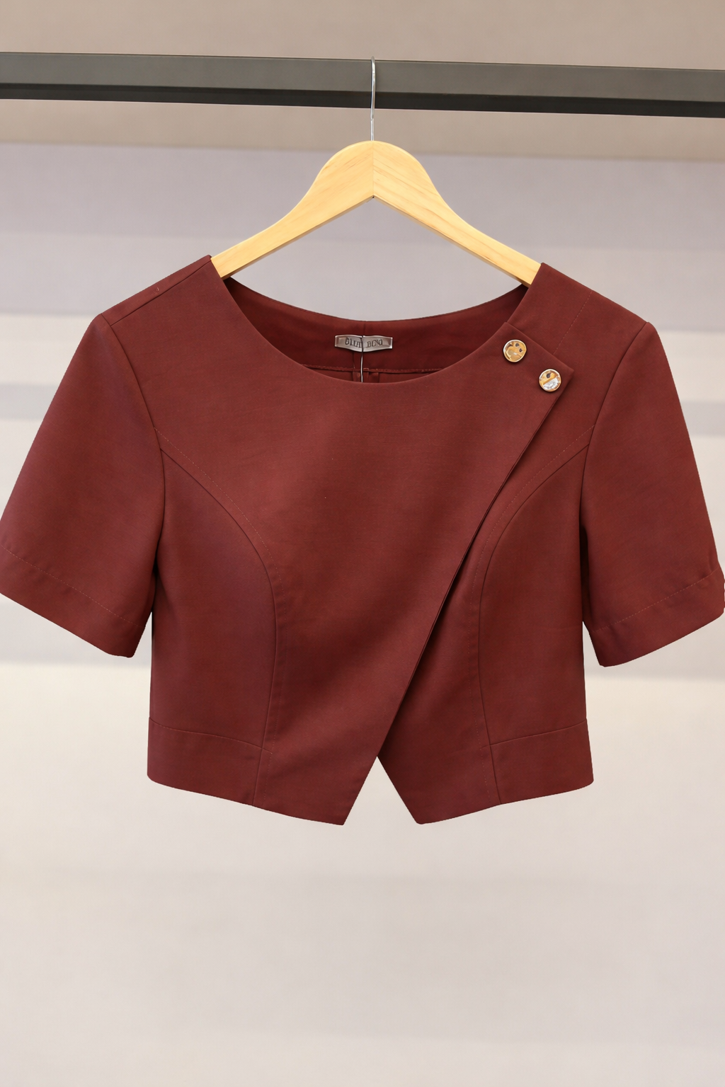 Top cropped de alfaiataria em tom terroso sofisticado, com modelagem estruturada que valoriza a silhueta de forma elegante. O design assimétrico é o grande destaque da peça, criando um visual moderno e diferenciado, enquanto o decote arredondado traz equilíbrio e feminilidade.