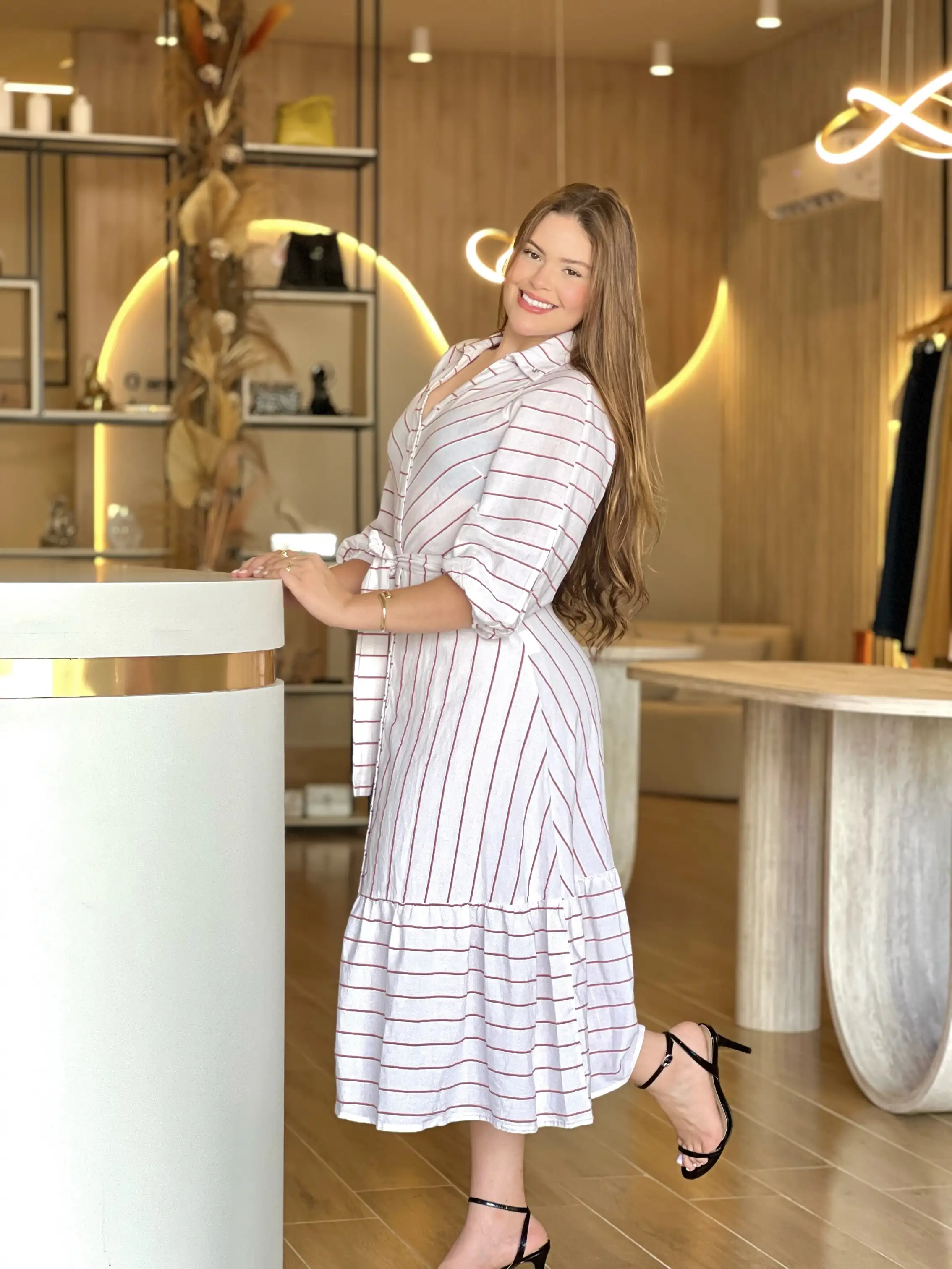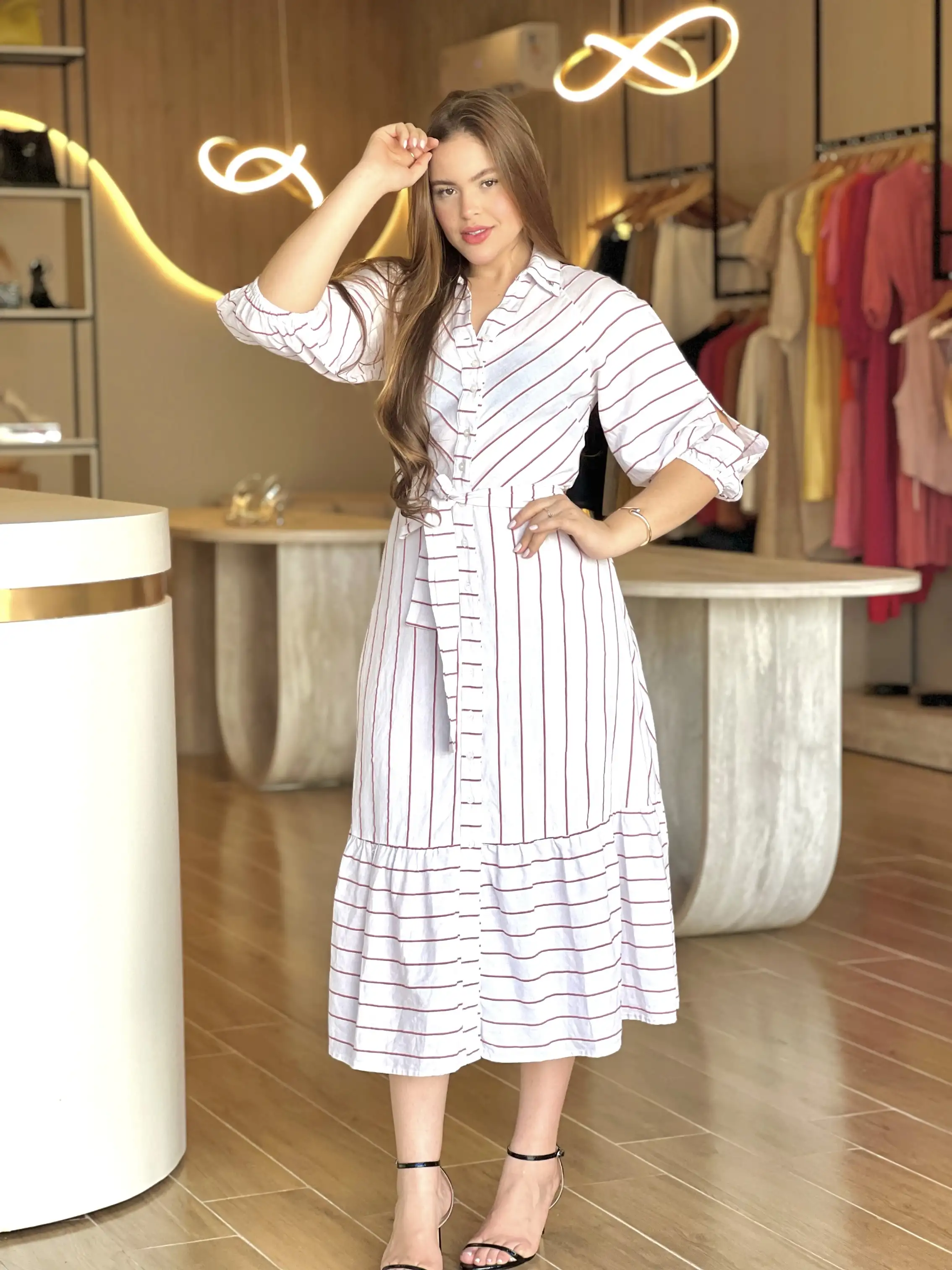 Vestido Chemise Listrado Mangas Bufantes Via Tolentino