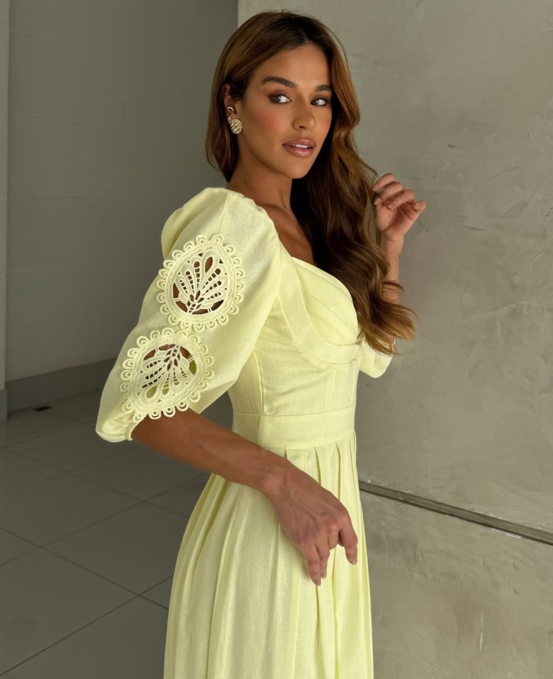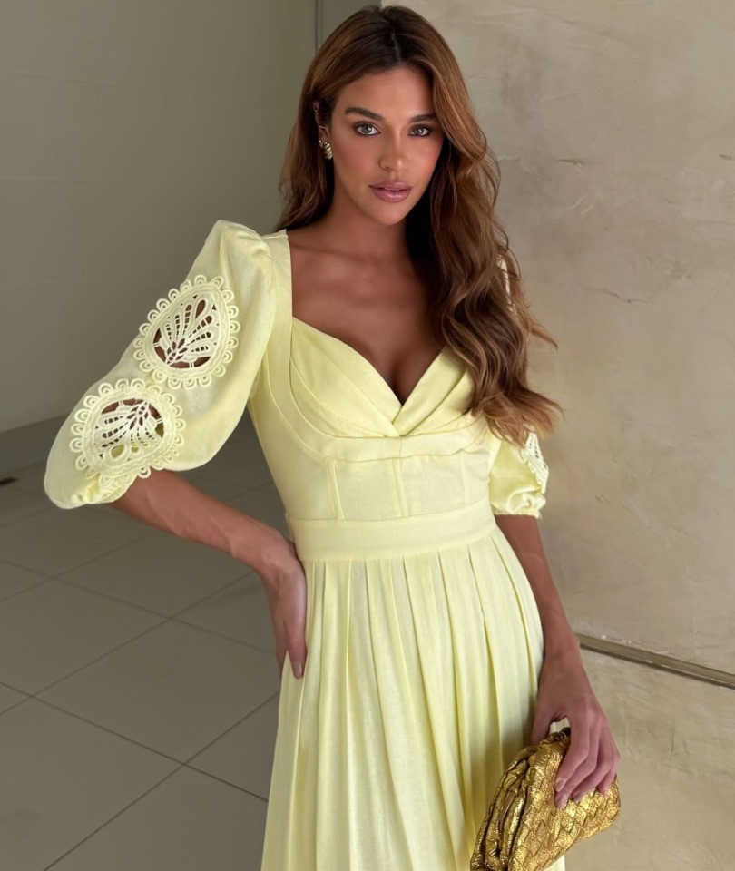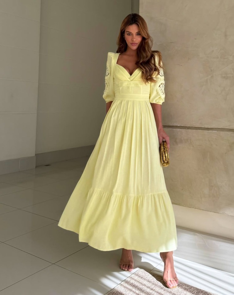 O decote em V com pregas suaves valoriza o colo de forma elegante, enquanto a cintura marcada realça a silhueta com delicadeza. As mangas 3/4 levemente bufantes, com detalhes bordados vazados, trazem um toque romântico e sofisticado à peça, elevando o visual com charme artesanal.
