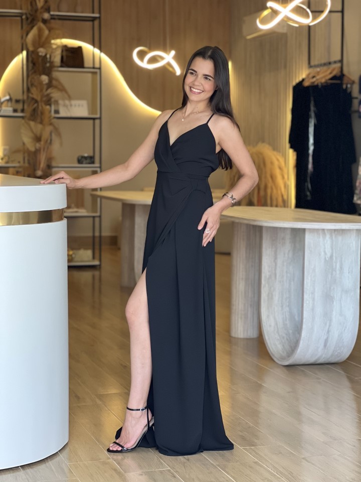 Elegante e atemporal, o vestido longo preto é aquela peça curinga que une sofisticação e sensualidade na medida certa. Possui decote em V que valoriza o colo, alças finas delicadas e modelagem que acompanha o corpo de forma fluida, garantindo conforto e elegância ao vestir.