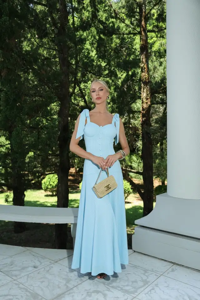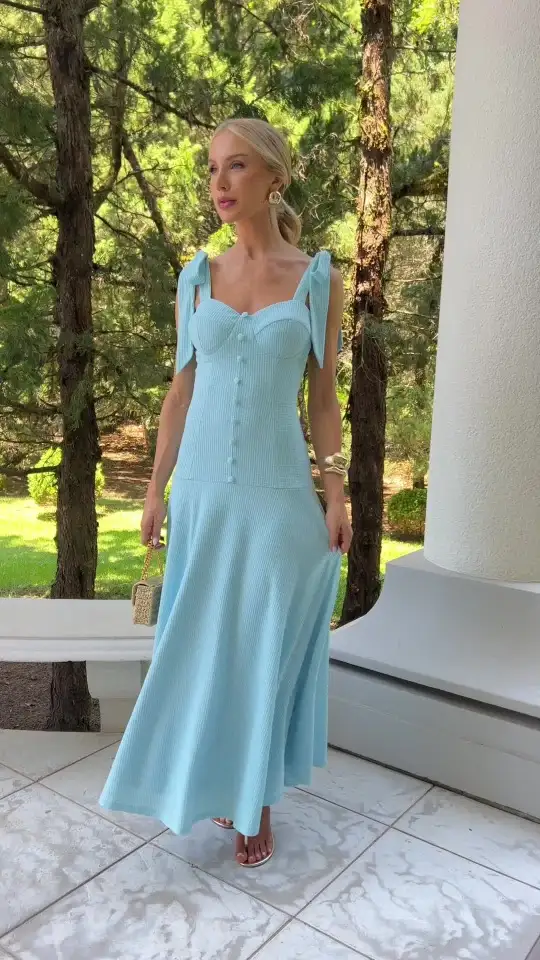 Conjunto de crepe azul: Composto por saia midi com cós anatômico e estruturado com recortes, o conjunto possui saia franzida e zíper de metal nas costas. O top, com modelagem corset e barbatanas, traz um toque de estrutura e elegância. As alças flexíveis e os laços do mesmo tecido aplicados no decote completam o look.