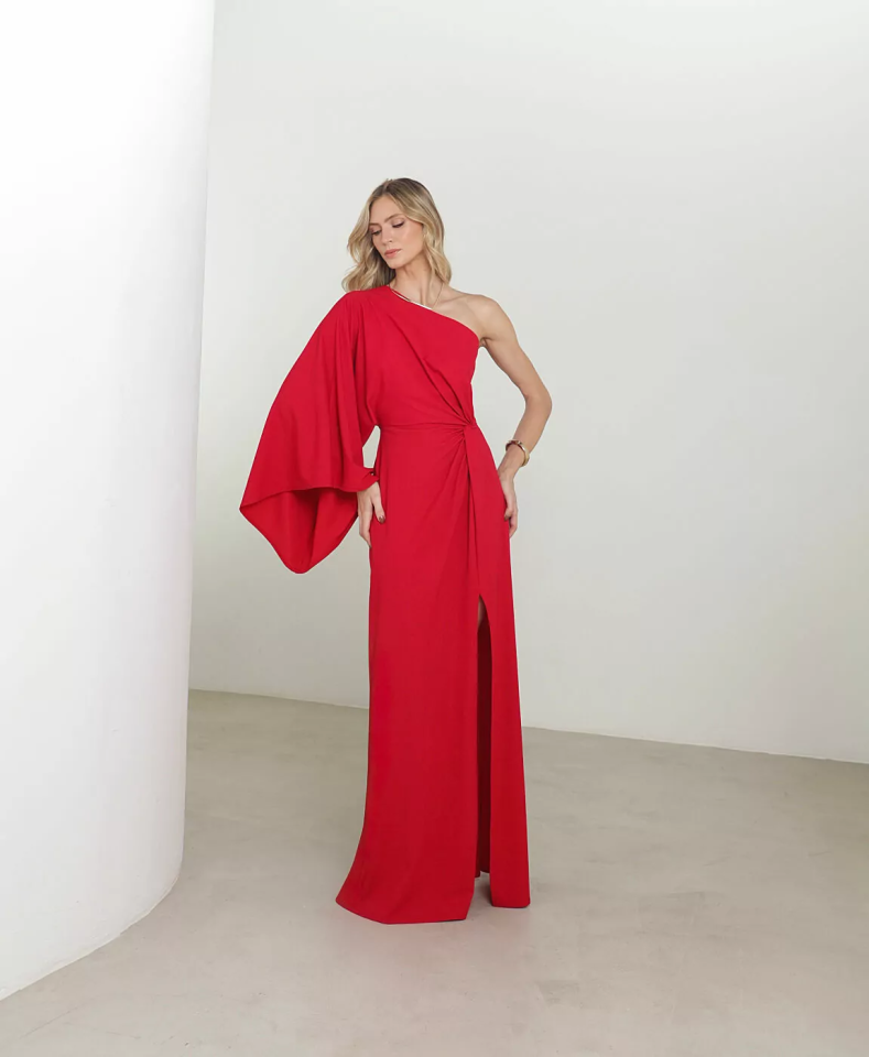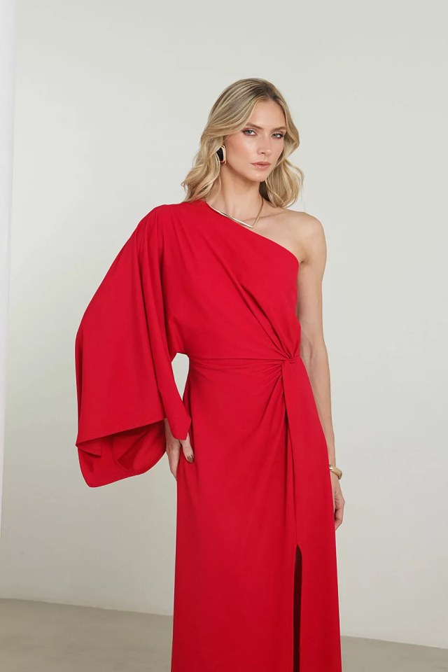 Vestido longo em tom vermelho intenso, com design sofisticado e impactante, ideal para ocasiões especiais. O modelo um ombro só traz modernidade e elegância, enquanto a manga ampla fluida cria um visual imponente e fashionista.